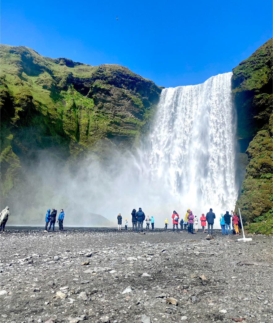 Skógafoss - The Roaring Giant - Next on your journey is Skógafoss, a mighty waterfall known for its thundering power and ethereal mist. Climb the staircase alongside the falls to witness panoramic views of the surrounding landscapes. Skógafoss is a place where the forces of nature are palpable, and the beauty is boundless.